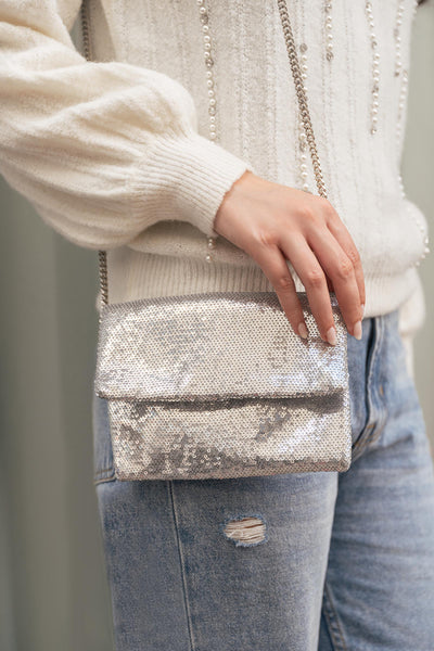 Crafted with sequin mesh and accented with a silver-tone chain strap, this compact yet trendy mini bag is perfect to hold all your essentials.