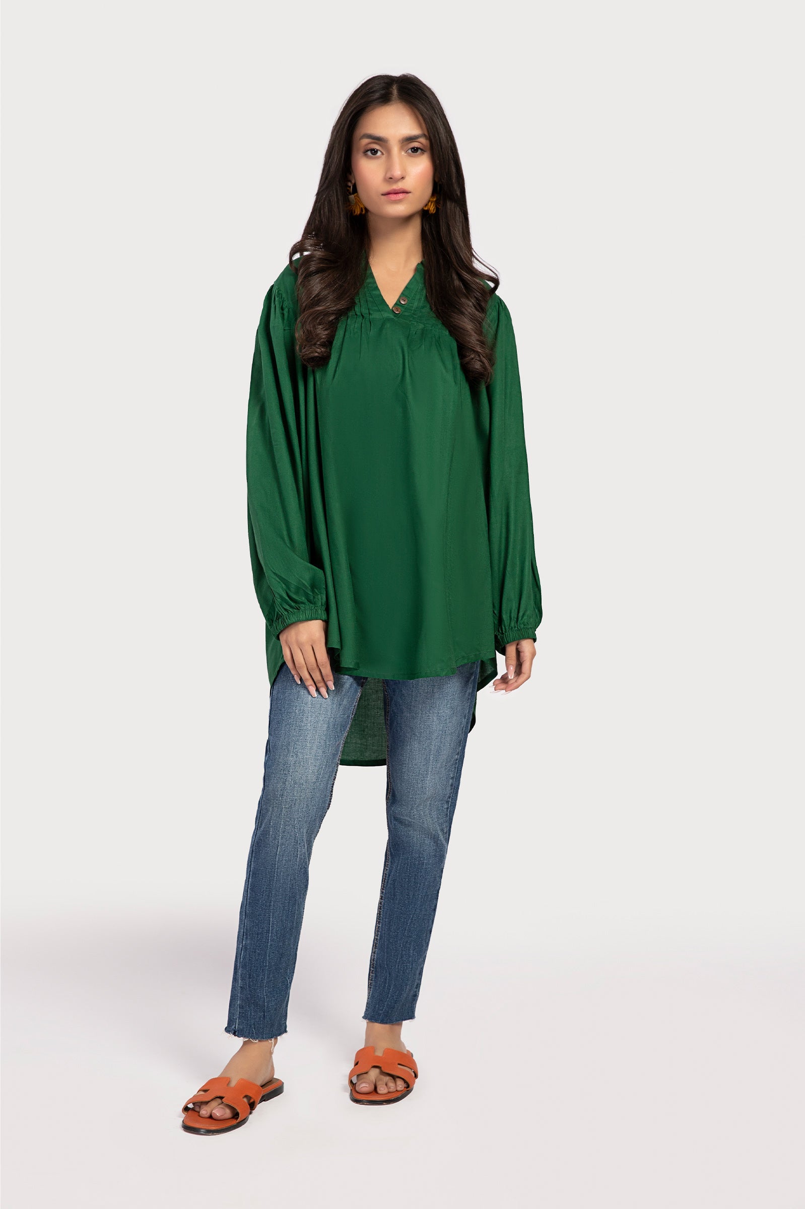 Solid top with pin tucks and button details.