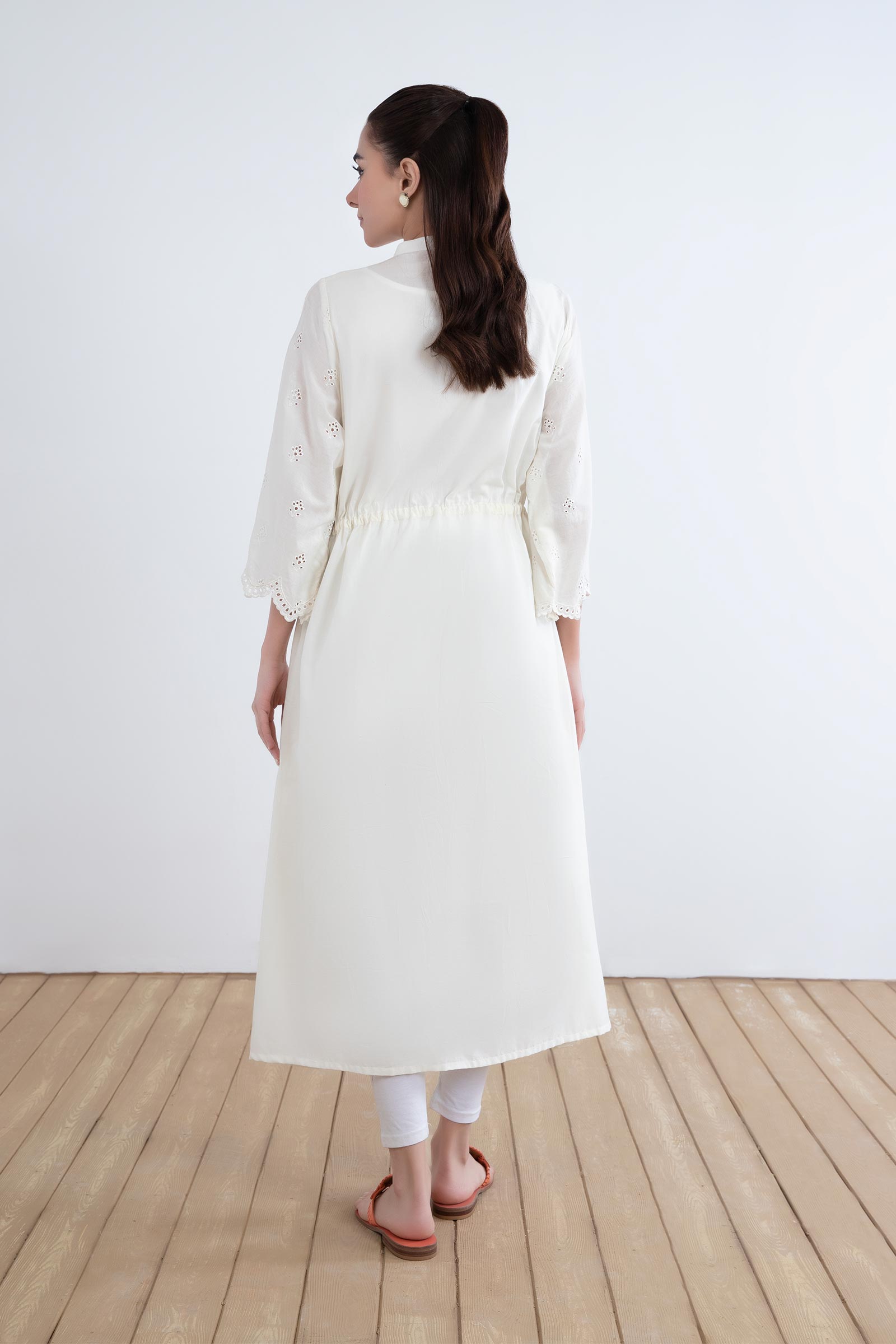 Details: Dyed Front & Back, V Collar Neckline, Drawstring On Waist Line, All-Over Schiffli Embroidered Front