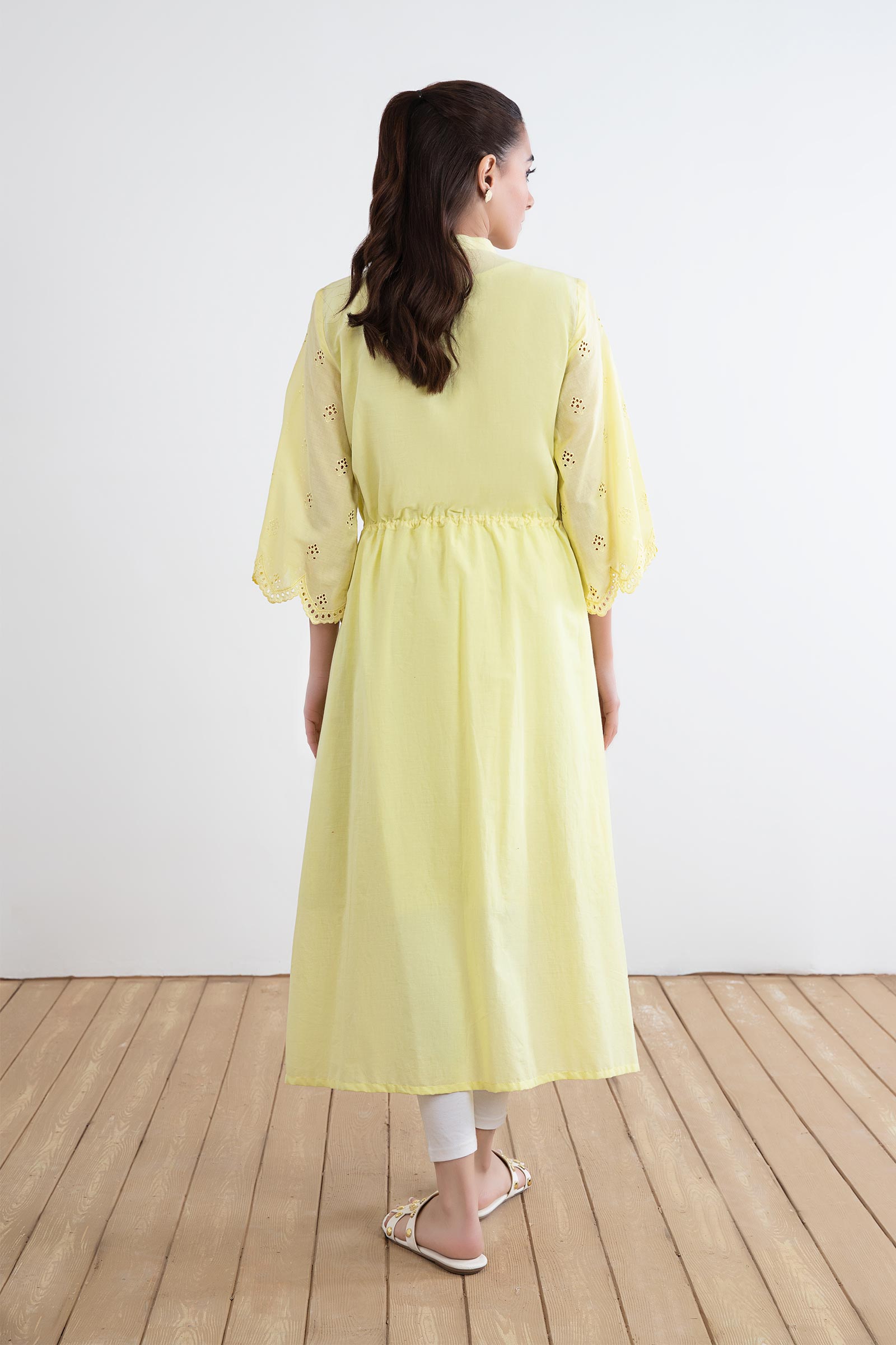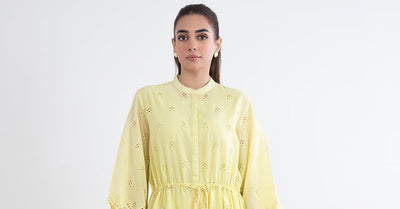 Exude charm this season with our yellow embroidered lawn dress adorning the canvas with schiffli embroidery for understated elegance.