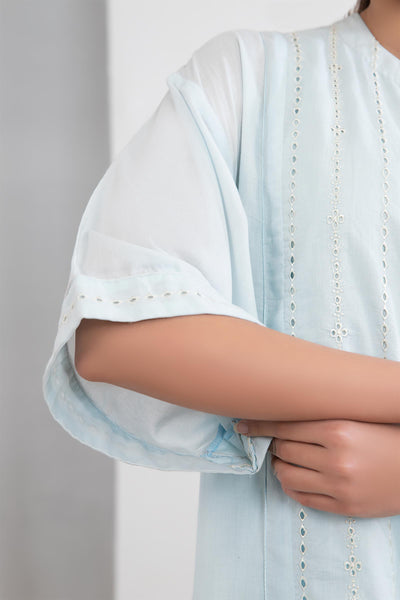 Behold the exquisite allure of our baby blue embroidered lawn dress adding a touch of elegance with intricate schiffli embroidery.