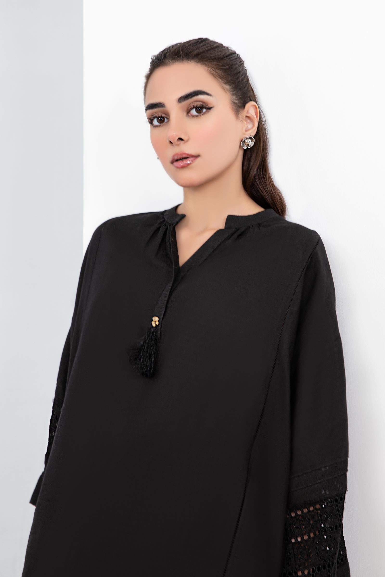 Immerse yourself with our black two-piece dyed dobby lawn suit crafting elegance with schiffli embroidery and delicate pleats.