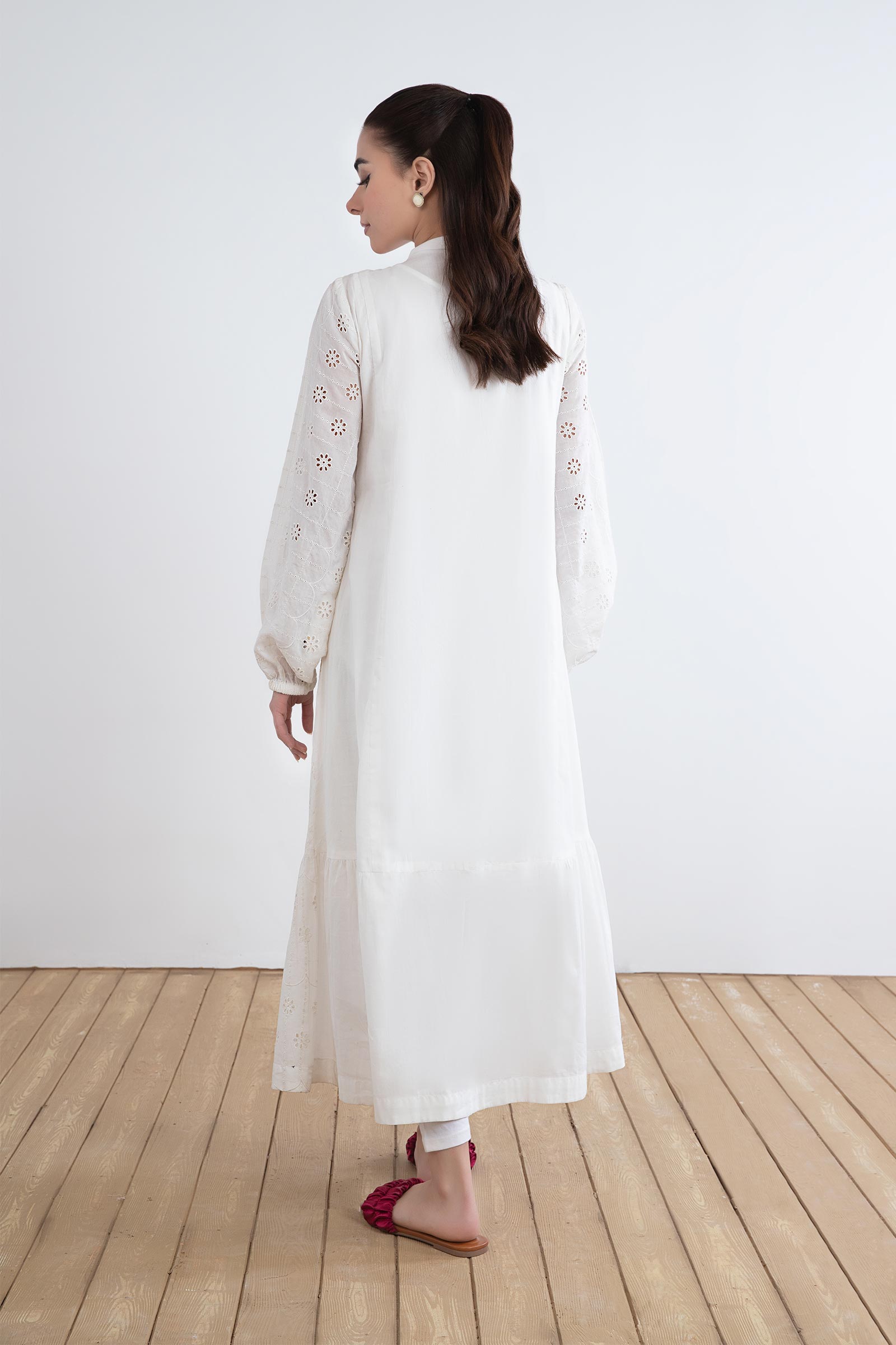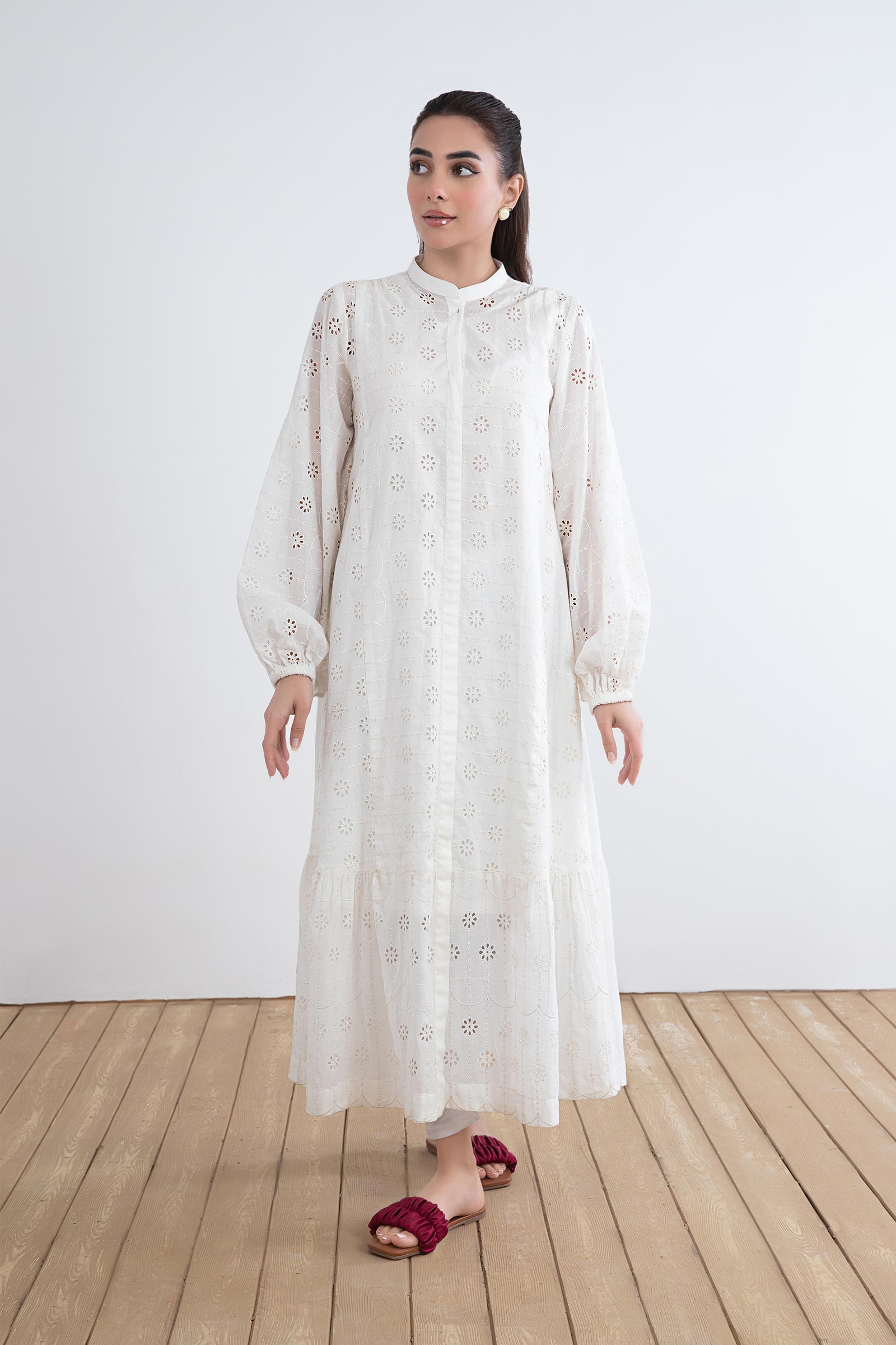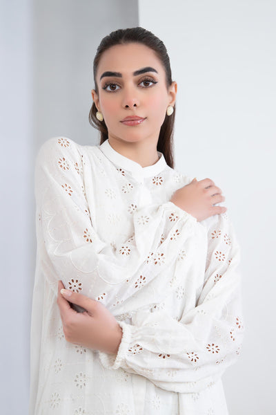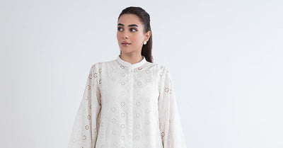 Details: Dyed Front & Back, Band Collar Neckline, Gathered Full Sleeves, All-Over Schiffli Embroidery Front