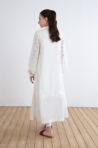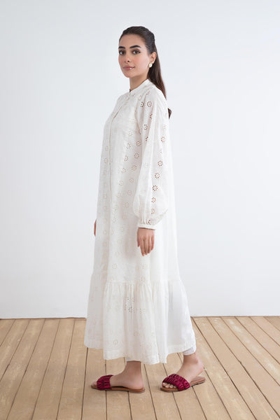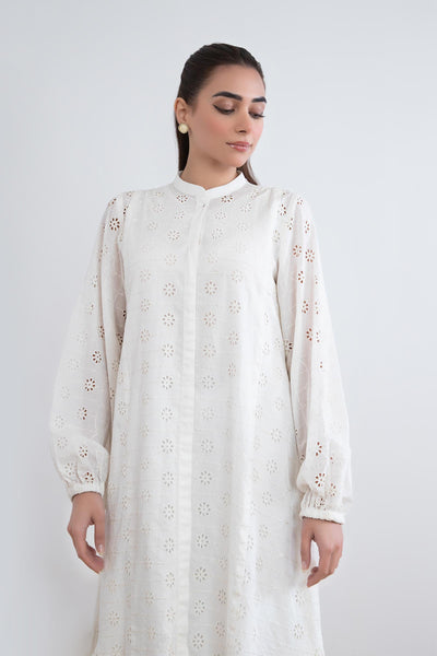 Add a twist to your everyday style with our embroidered lawn dress featuring a soft white canvas adorned with schiffli embroidery and delicate pleat detailing.