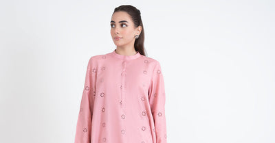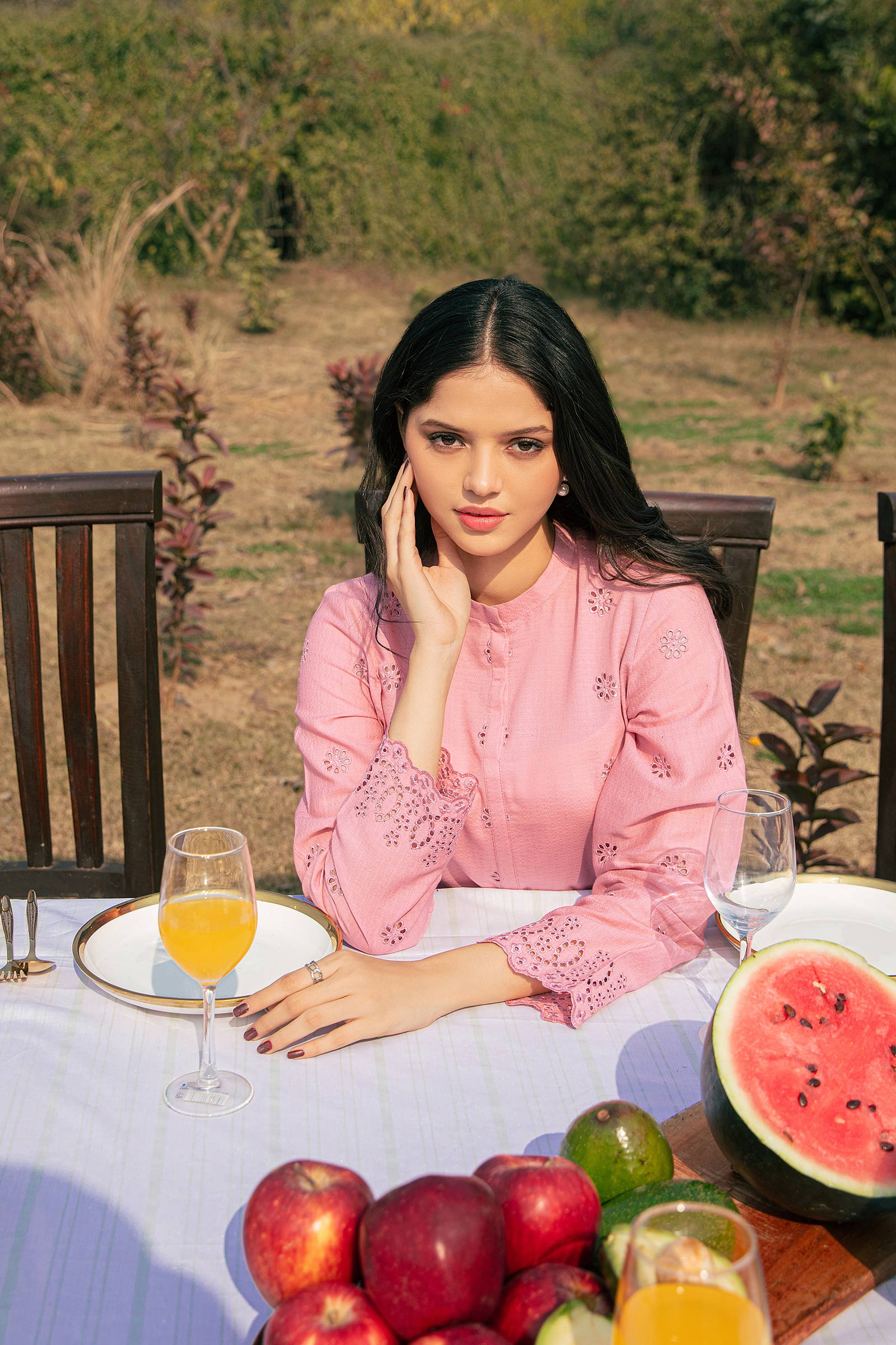 Uplift your daily style with our ash pink embroidered dobby lawn co-ord set featuring intricate schiffli embroidery in delicate floral patterns that instantly captivate the eye.