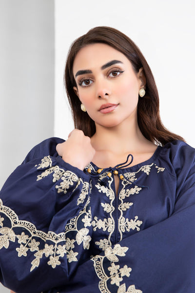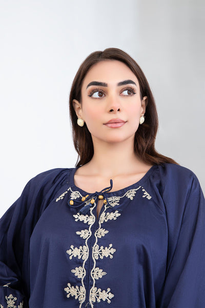Adding an aura of timeless beauty with our embroidered arabic lawn tunic dress featuring a navy blue canvas adorned with graceful florets embroidery and tassels detailing.