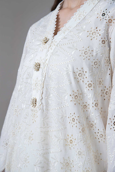 Bursting into full bloom, our embroidered lawn kurta features a white canvas meticulously crafting floras with thread and schiffli embroidery and organza detailing.
