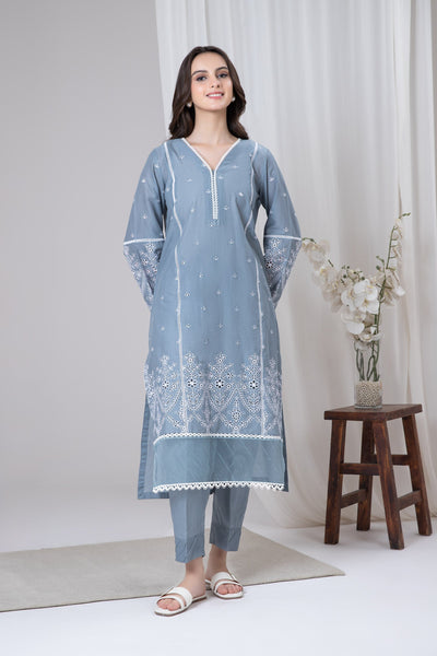 Create a statement look with our embroidered lawn kurta gracefully adorning the soft grey canvas with schiffli embroidery clad with pleated organza detailing.