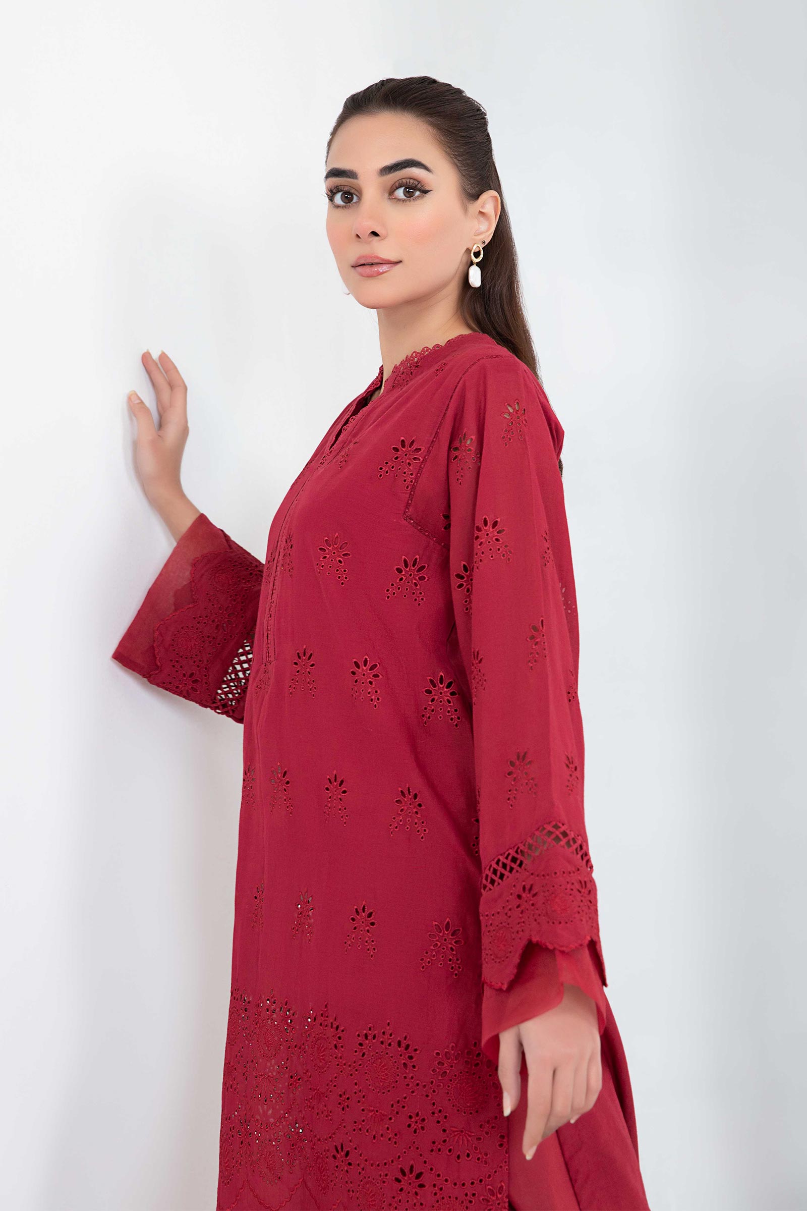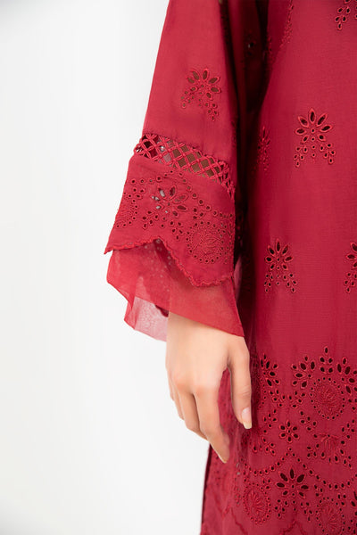 Flowing work of art with our embroidered lawn kurta gracing the red canvas with schiffli embroidery and organza detailing.