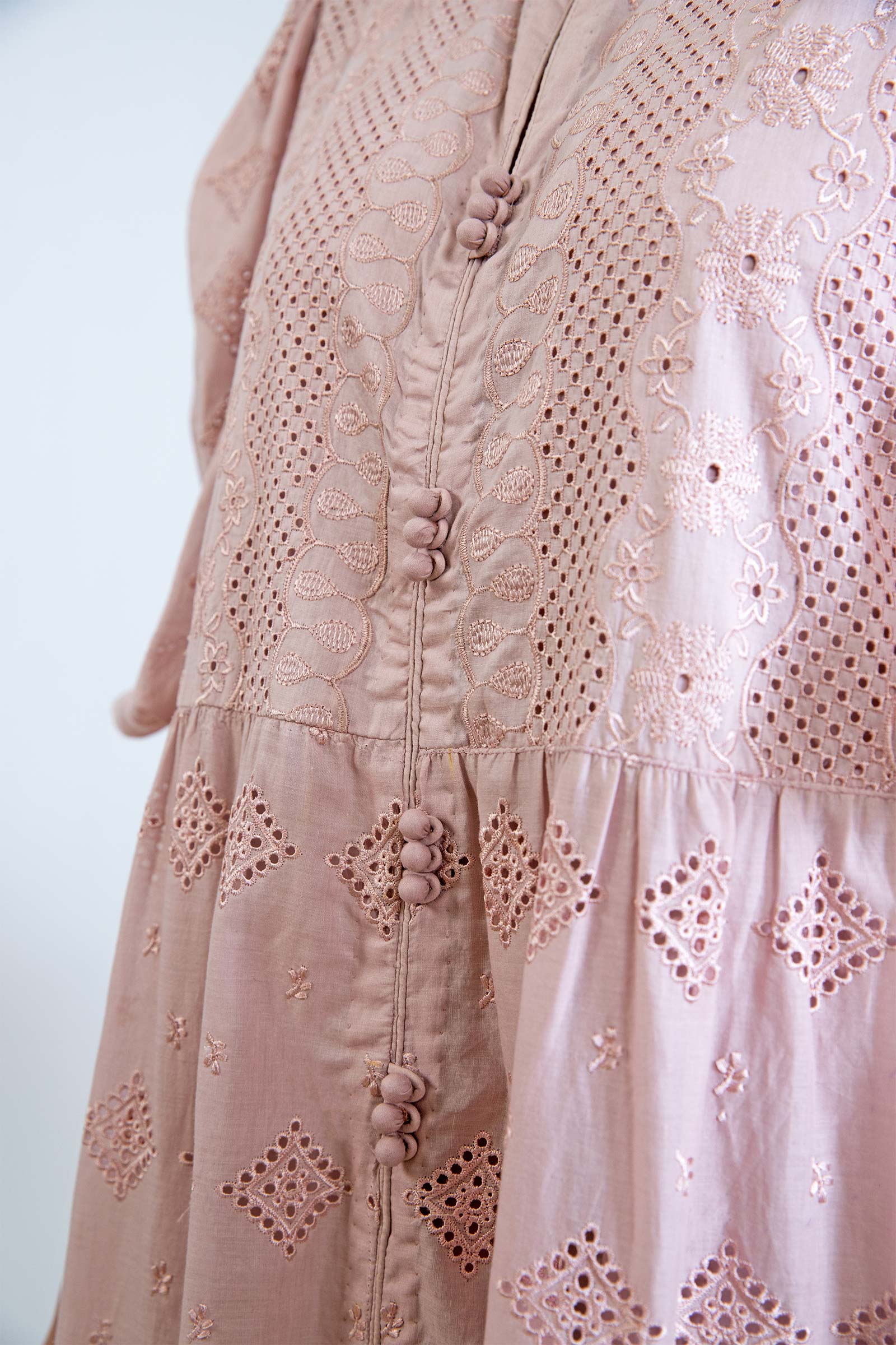Details: Dyed Long Dress, Band Collar Neckline With Button Detailing, Three-Quarter Gathered Sleeves, All-Over Schiffli Embroidery With Pleat Detailing
