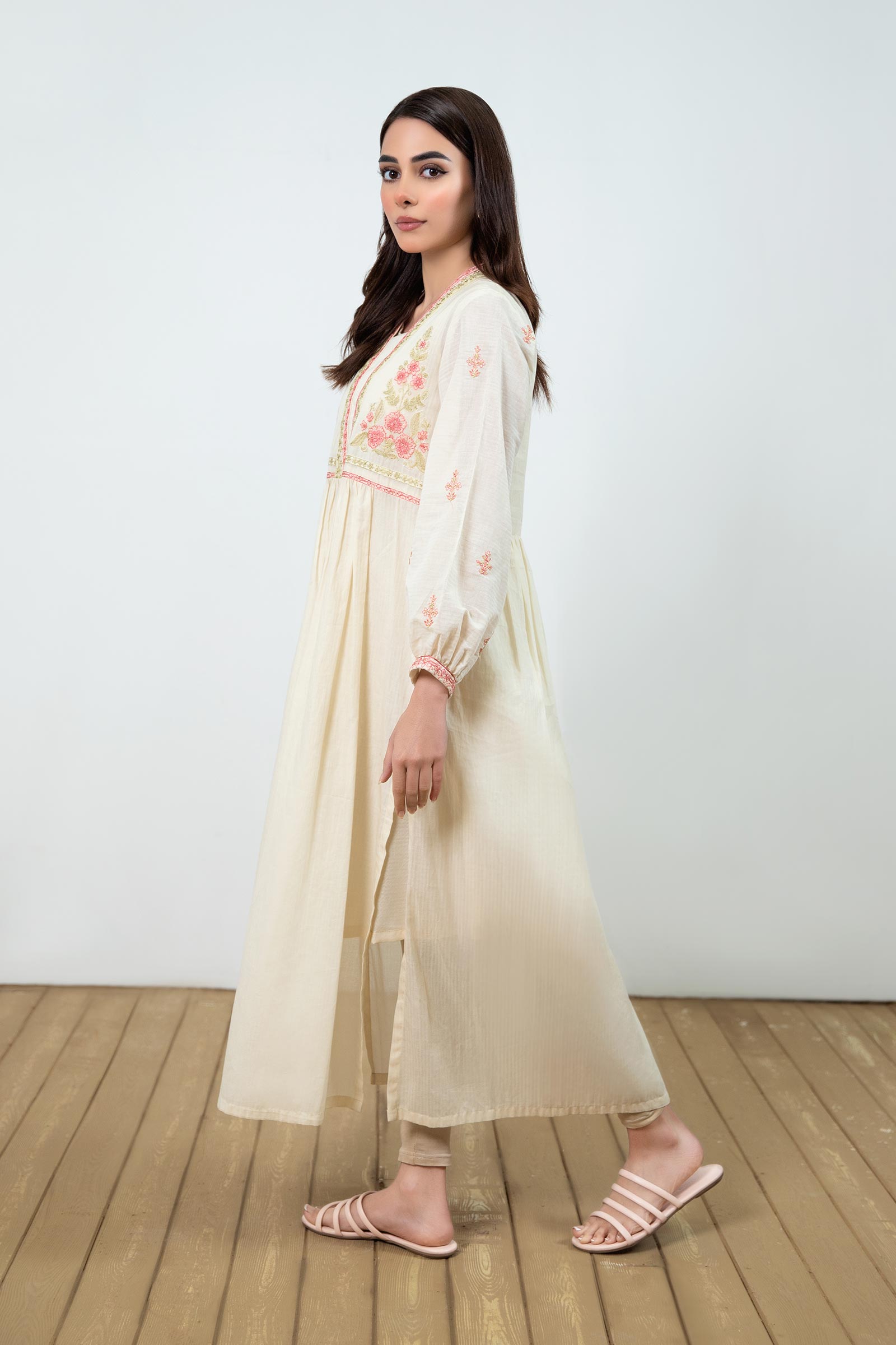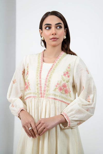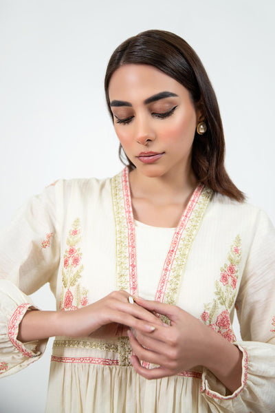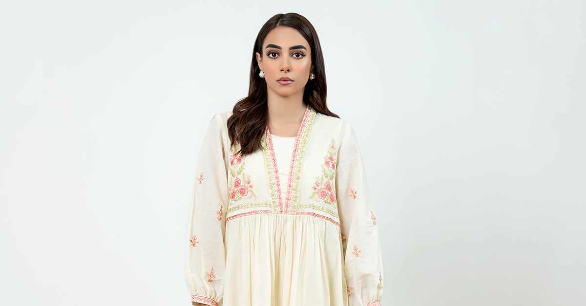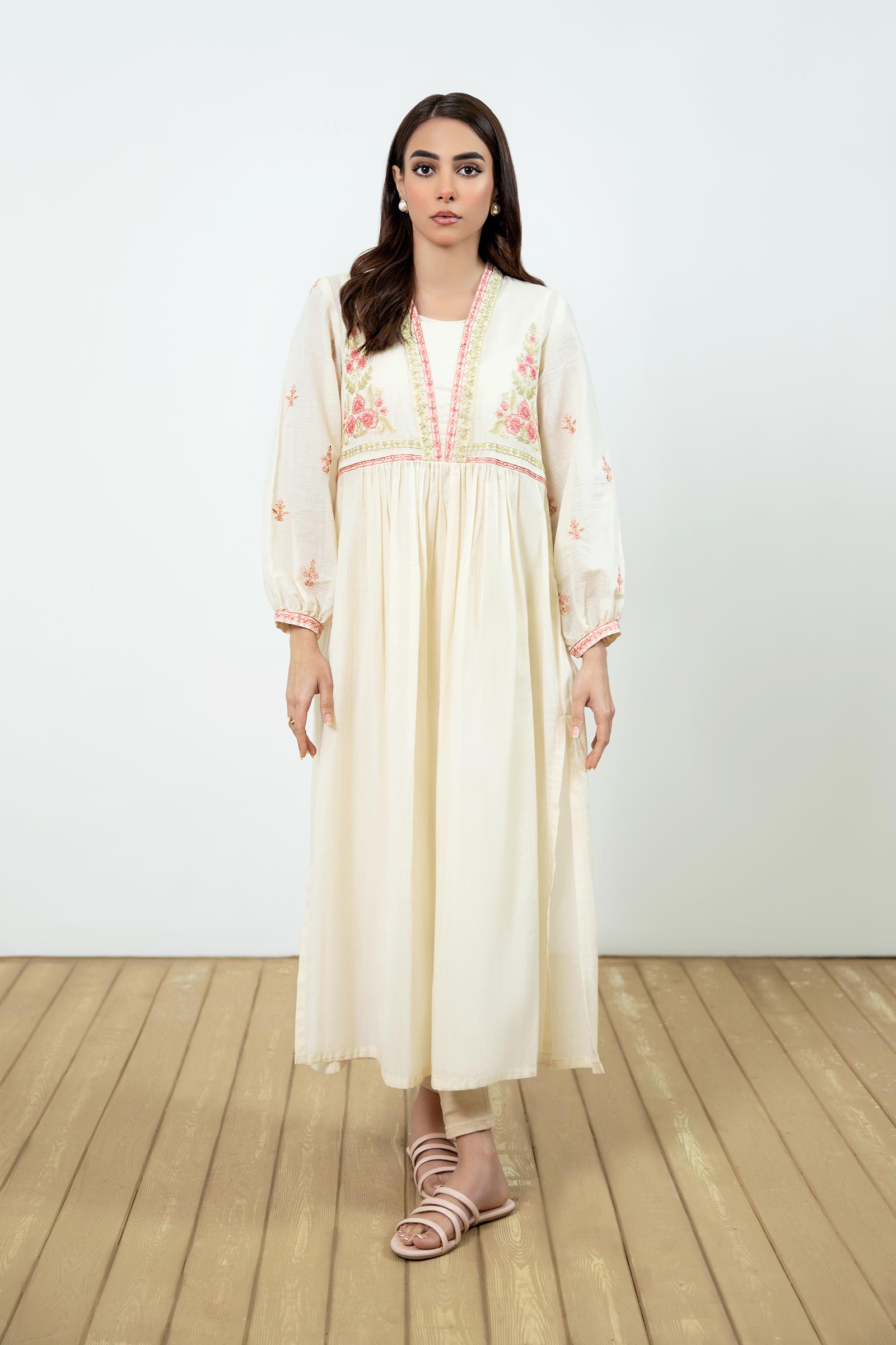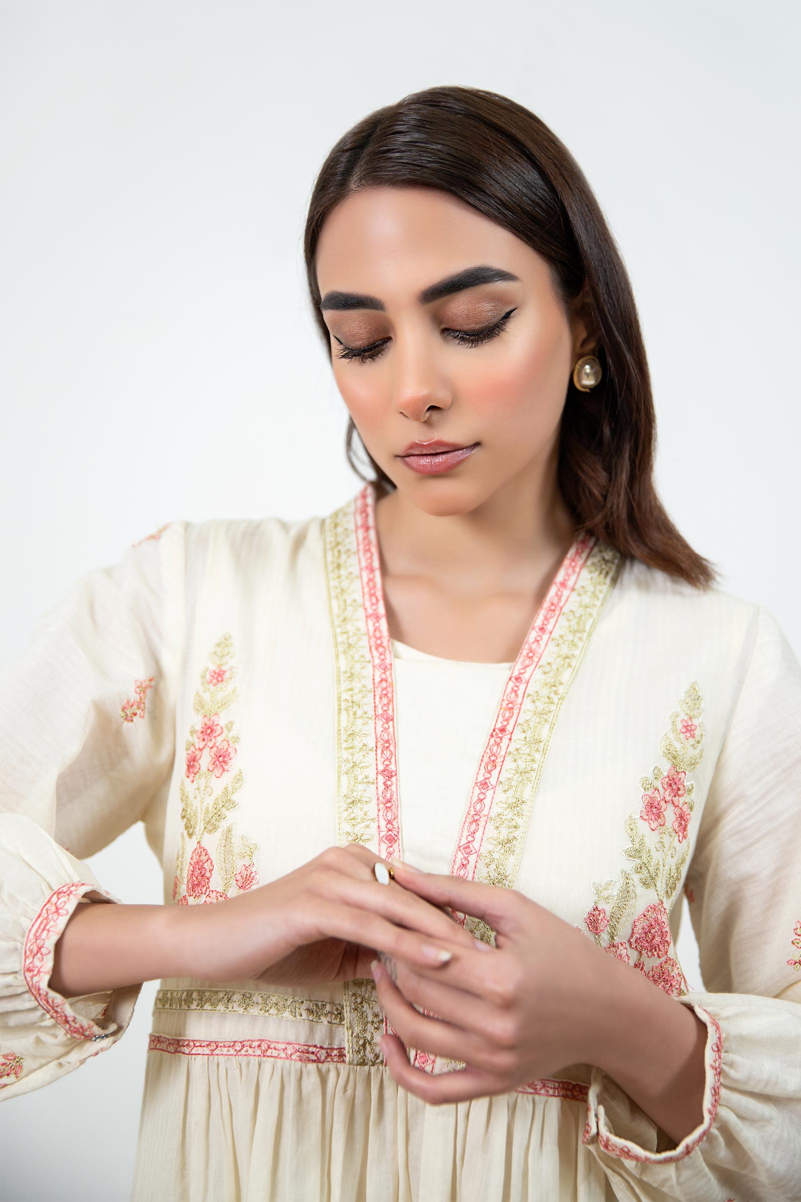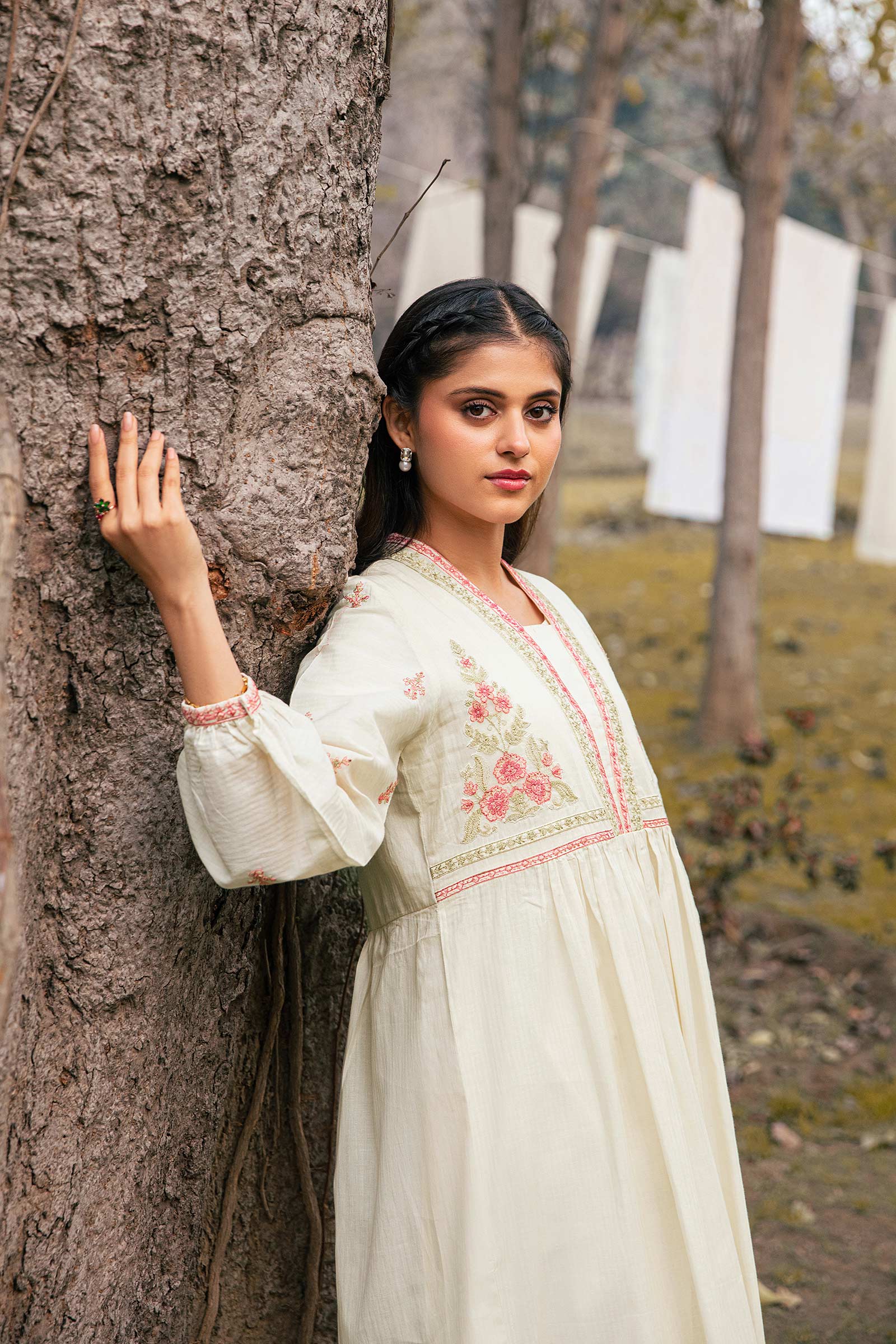 Dive into floral fantasy with our off-white dyed dobby lawn dress weaving festoons in soft coral threads.