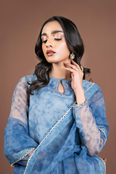 Feel like a diva in this fairytale two-piece printed organza ensemble digitally crafting abstract patterns in a scintillating grey palette and enhanced with shimmering sequins and tilla embroidery to style the festive events. It comes with dyed cigarette trousers detailed with lace and pin pleats.
