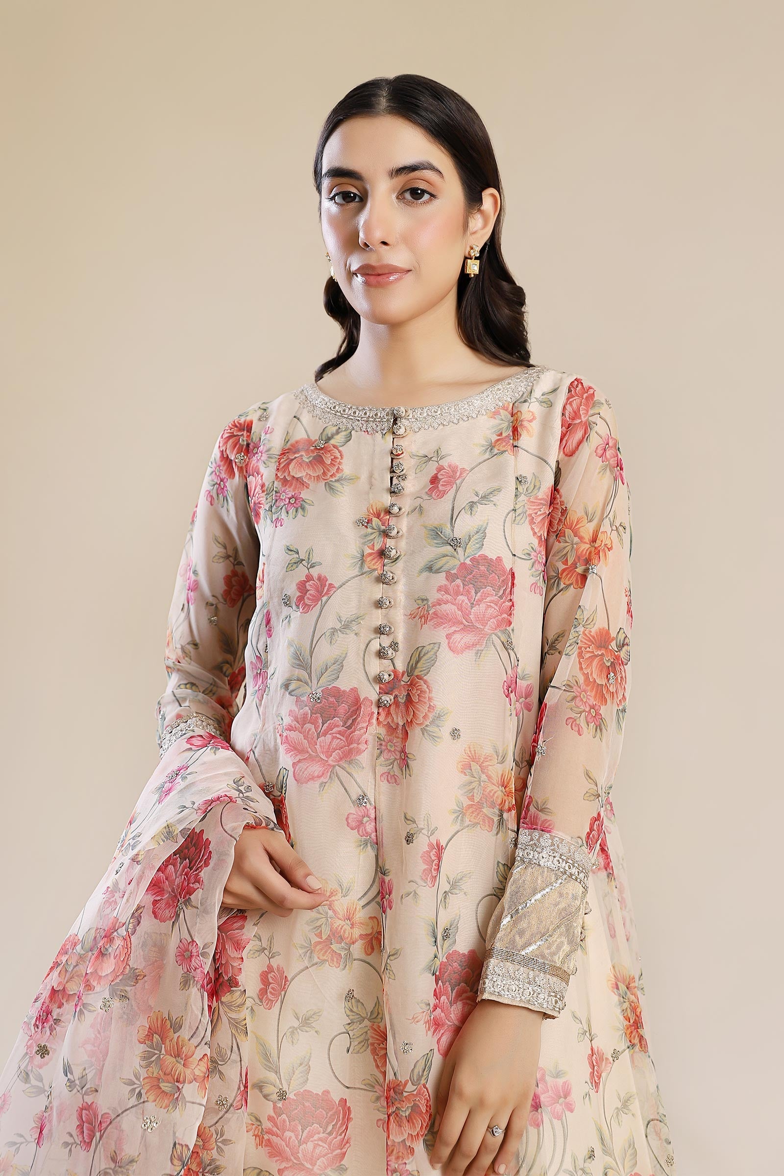 Full Length Embroided Sleeves With Embroidery, Loop Buttons, Lace & Organza Detailing