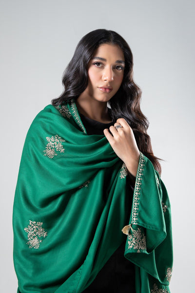 Dyed Shawl With All-Over Embroidery & Fabric Trims On Border