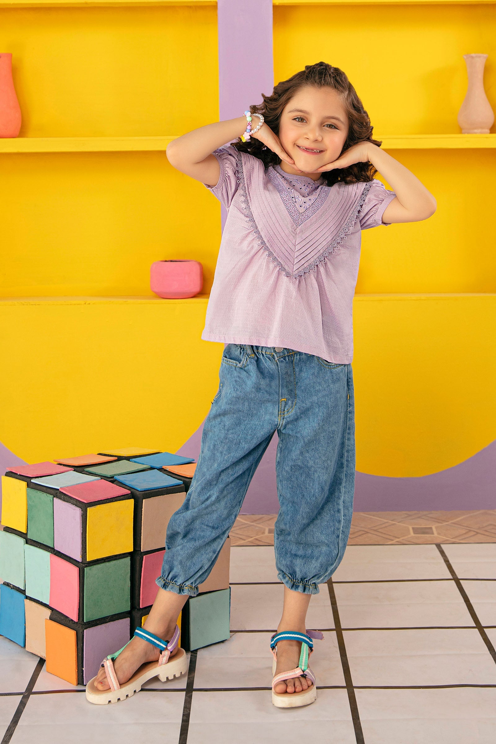 Dobby Lawn with schiffilie pleated and ruffles detailing top.