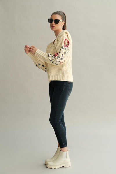 Wrap yourself in this sheer sophistication with our Floral Sequin Sweater in a mesmerizing beige shade. Made with soft and lightweight wool, it offers unparalleled comfort and style.