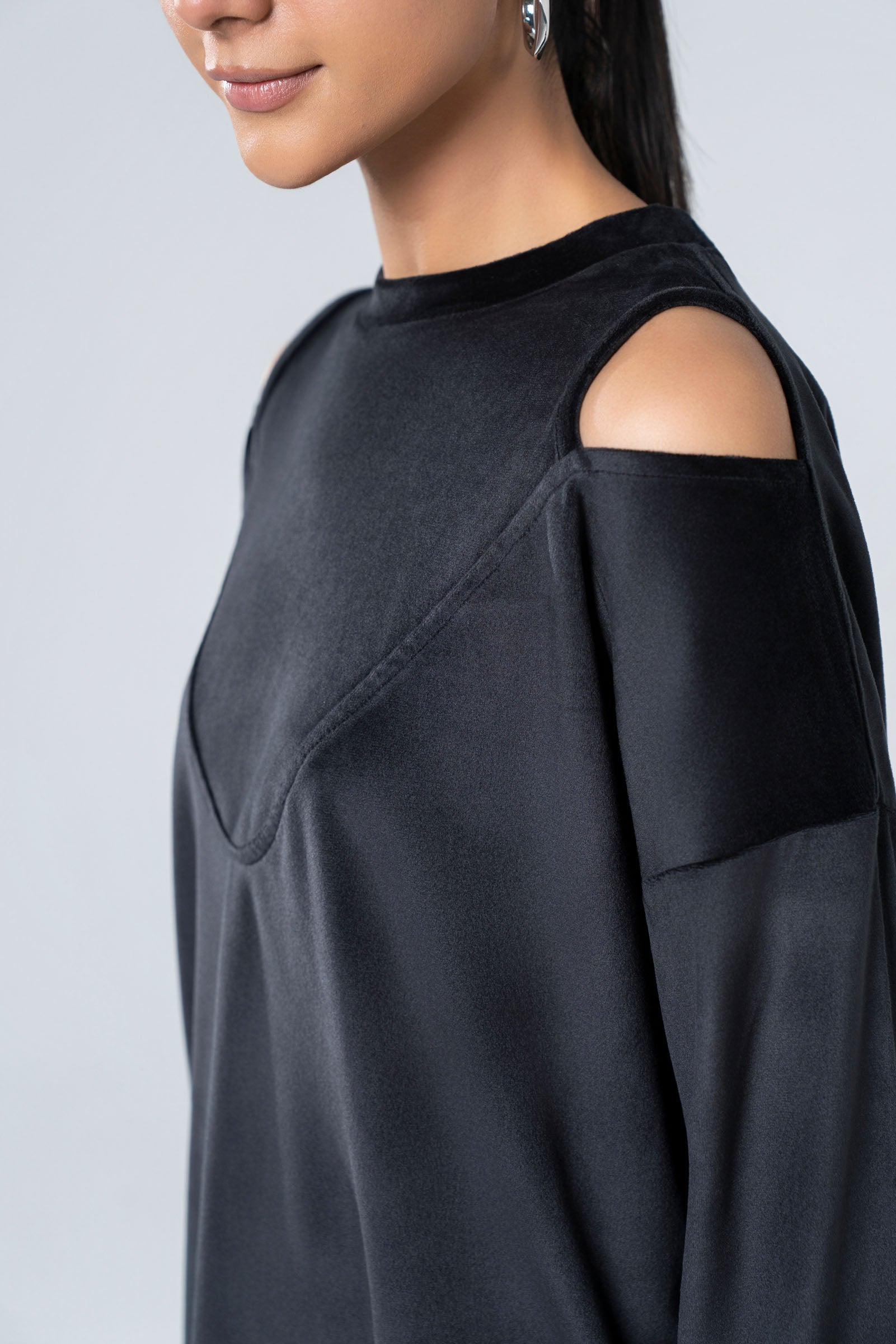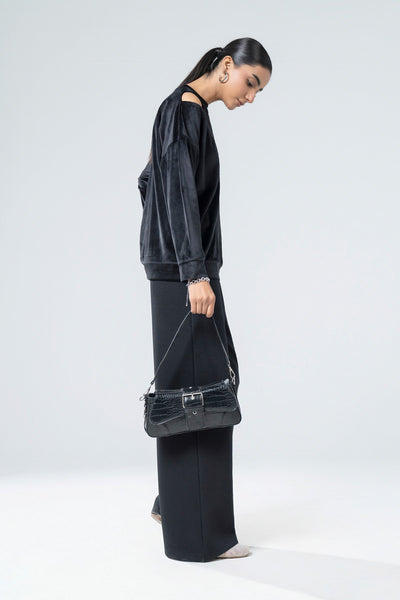 Coord Set With Velour Halter Top Featuring Cut-Out Detail, Drop Shoulders & Long Sleeves, Paired With Wide-Leg Bottoms.