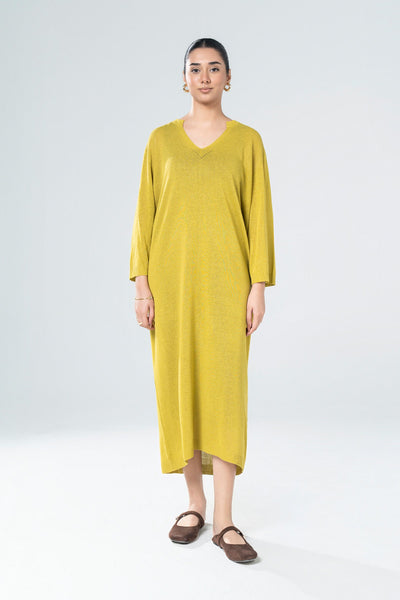 V-Neck Sweater Dress With Dropped Shoulders & Three-Quarter Sleeves.