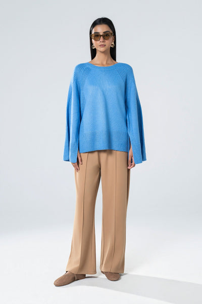Sweater With Ribbed Round Neckline & Hem, Long Sleeves With Slits & Side Slits At Hem.