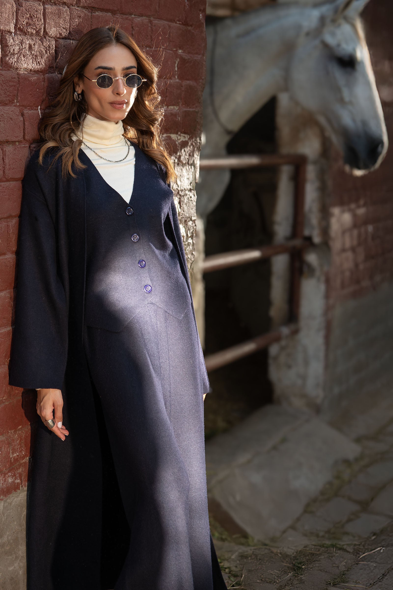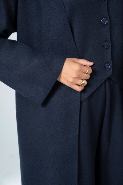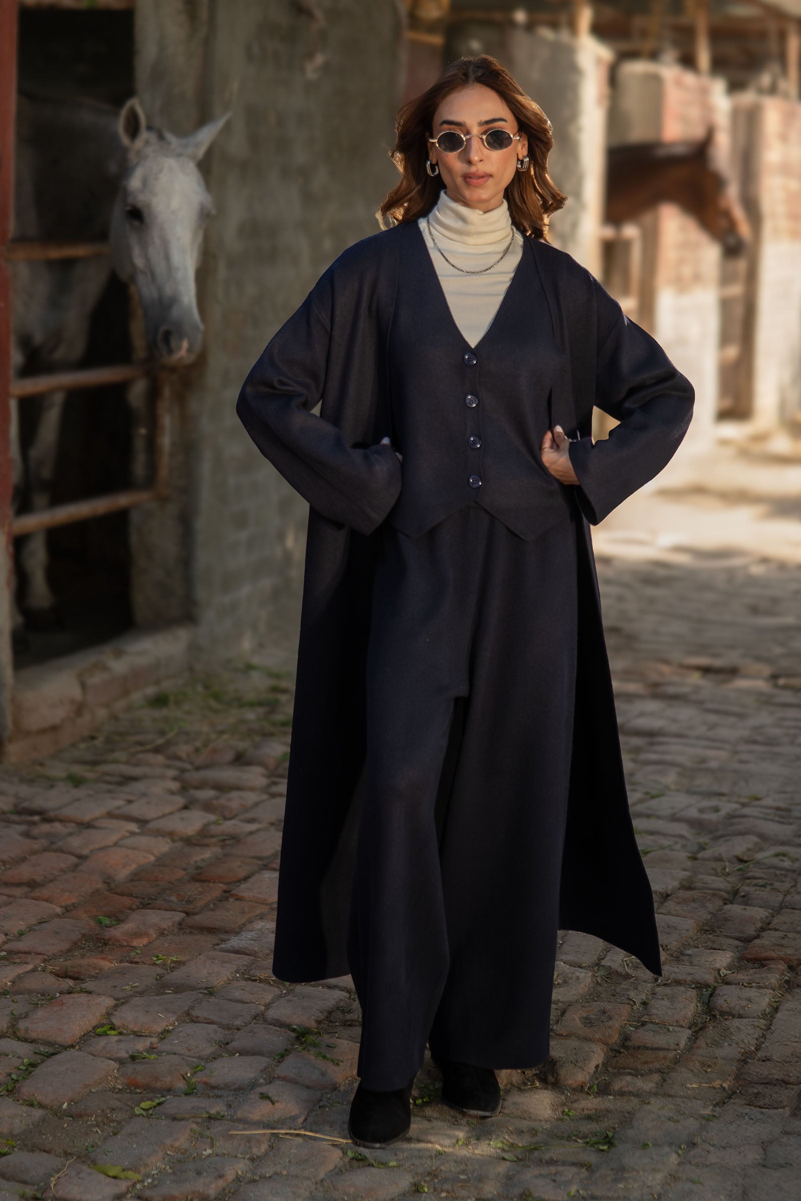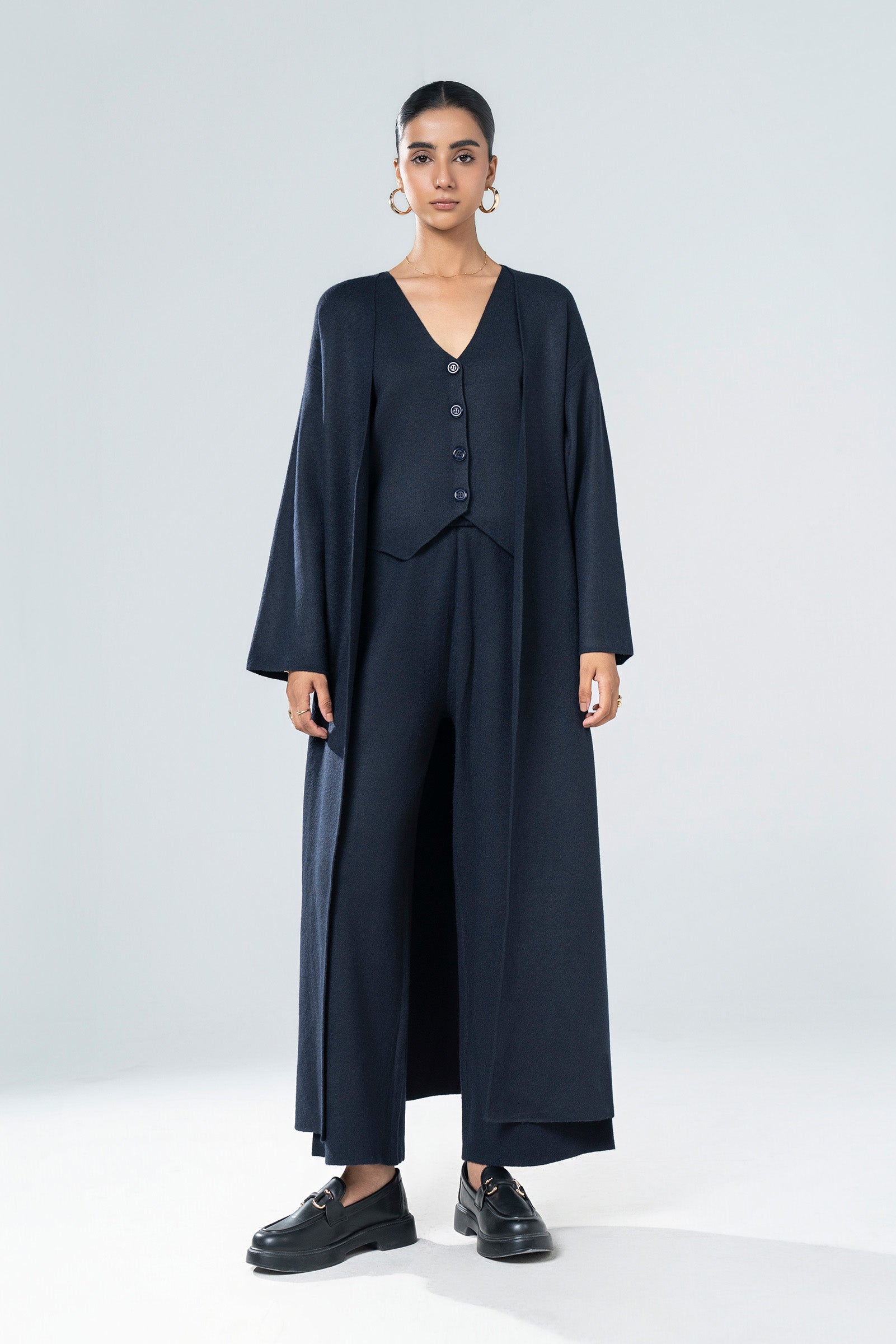 Co-ord Set With V-Neck Sweater Vest Paired With Cardigan & Wide-Leg Bottoms.