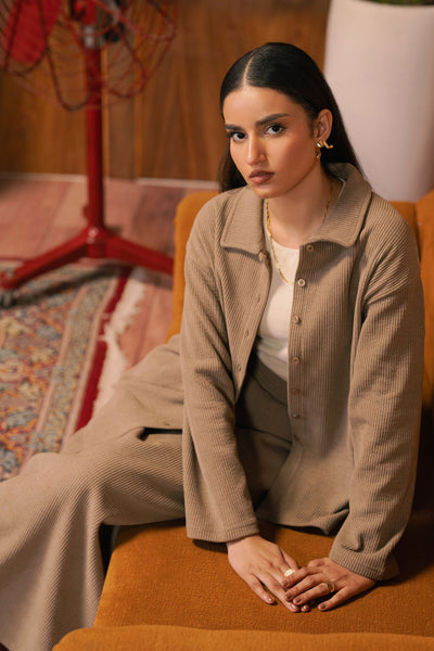 Co-ord Set With Collared Button-Down Long-Sleeve Top In Boxy Fit, Paired With Flared Skirt.